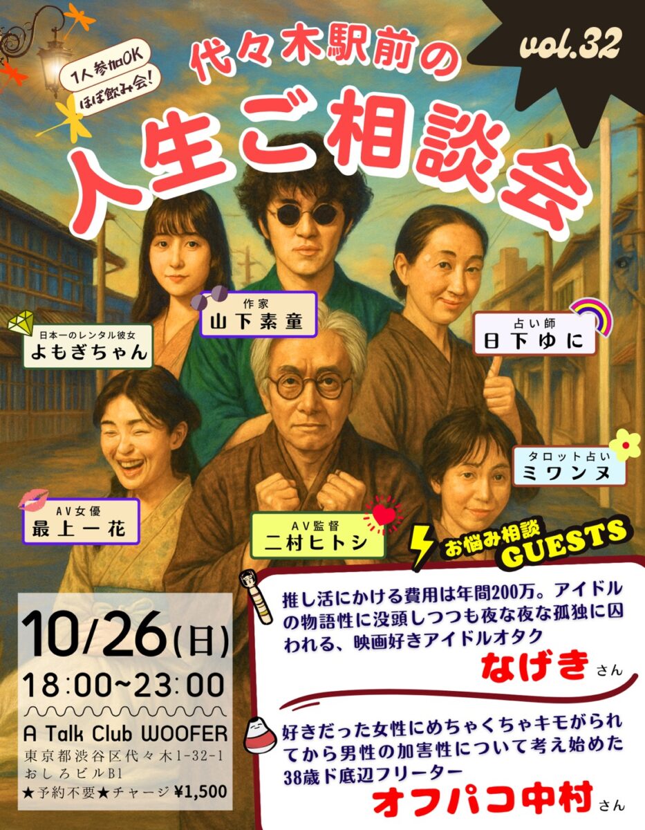◇公開お悩み相談トーク(聞き手)、二村ヒトシ(AV監督)、日下ゆに(占い師)、山下素童(作家)、ミワンヌ(タロット占い師)、よもぎちゃん(日本一高いレンタル彼女)、最上一花さん(AV女優)、◇第32回公開お悩み相談ゲスト、・推し活にかける費用は年間200万。アイドルの物語性に没頭しつつも夜な夜な孤独に囚われる、映画好きアイドルオタク「なげき」さん 、・好きだった女性にめちゃくちゃキモがられてから男性の加害性について考え始めた38歳ド底辺フリーター「オフパコ中村」さん