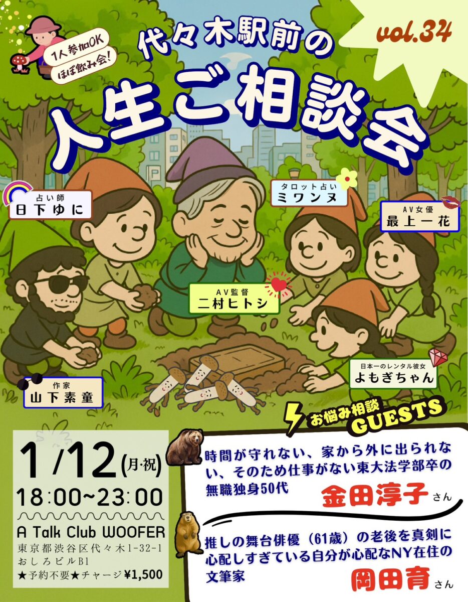 開場は18時からで、19時から壇上で二村ヒトシ、日下ゆに、山下素童、ミワンヌ、よもぎちゃん、最上一花の6人が、相談者を交えての公開お悩み相談トークをしますので、興味ある方はぜひ19時までにお越しください。