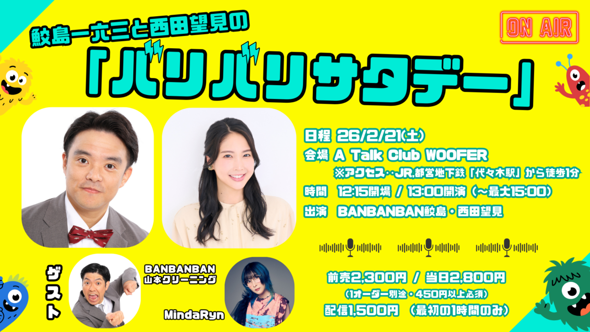BANBANBAN鮫島一六三と声優 西田望見が、土曜のお昼にお客様のお悩み相談に答えたり、なにかにチャレンジする ラジオ感覚のトークライブ!