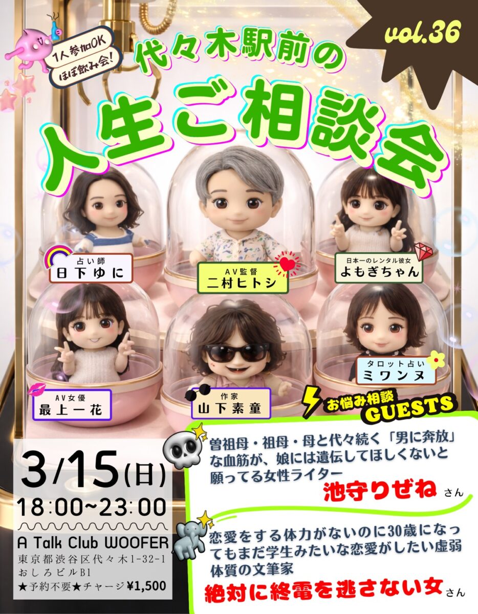 開場は18時からで、19時から壇上で二村ヒトシ、日下ゆに、山下素童、ミワンヌ、よもぎちゃん、最上一花の6人が、相談者を交えての公開お悩み相談トークをしますので、興味ある方はぜひ19時までにお越しください。