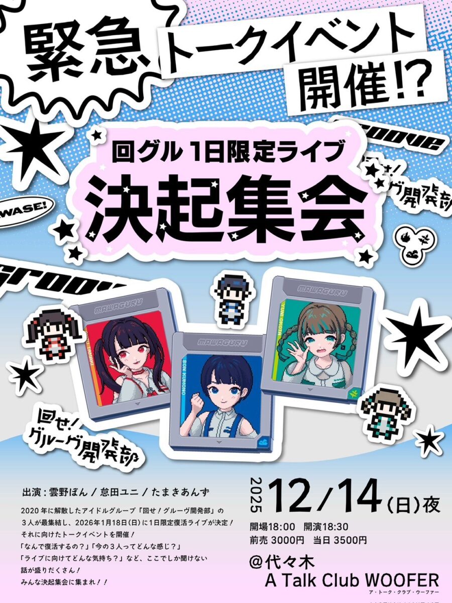 2020年に解散したアイドルグループ「回せ!グルーヴ開発部」の3人が再集結し、2026年1月18日に一夜限りの復活ライブが決定!